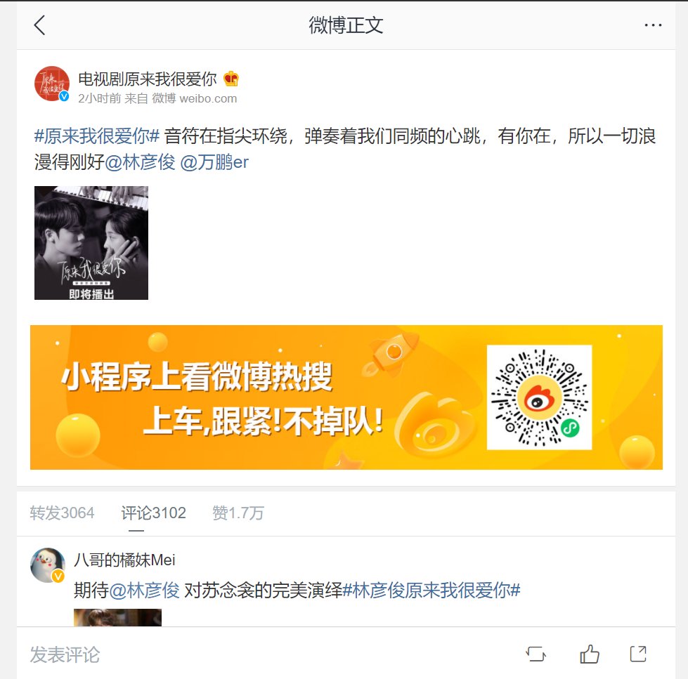 Source:原来我很爱你crush@微博 演員:林彥俊、萬鵬 《原來我很愛你》根據木浮生同名小說改編,編劇就是作者本人, 由林彥俊、萬鵬主演 ,講述即將畢業的大四學生桑無焉 (萬鵬飾) 夢想成為廣播人,喜歡一個筆名叫做「一今」的神秘詞曲人,對偶然遇見. 3月14日 10:00 来自 微博视频号 已编辑. 歌手 @魏晨 深情献唱,作词: @张鹏鹏powpow 、 @林乔 ,作曲: @吴姝霆stacey. 大眼清秀女友被證實「追星成功」 微博甜蜜寫:覺得你好,是陷阱也跳 吳亦凡女友原來又是個粉絲追星成功的勵志故事啊~ by inna chou 與 eva lee. 《 原來我很愛你 》,是當代都市劇,根據木浮生同名小說改編,由 林彥俊 、 萬鵬 領銜主演,於2020年9月14日開機,同年12月2日殺青。.